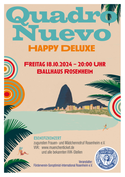 Wir laden Sie herzlich zu unserem Benefizkonzert mit Quadro Nuevo - Happy Deluxe am 18.10.2024, um 20:00 Uhr in das Ballhaus Rosenheim ein.